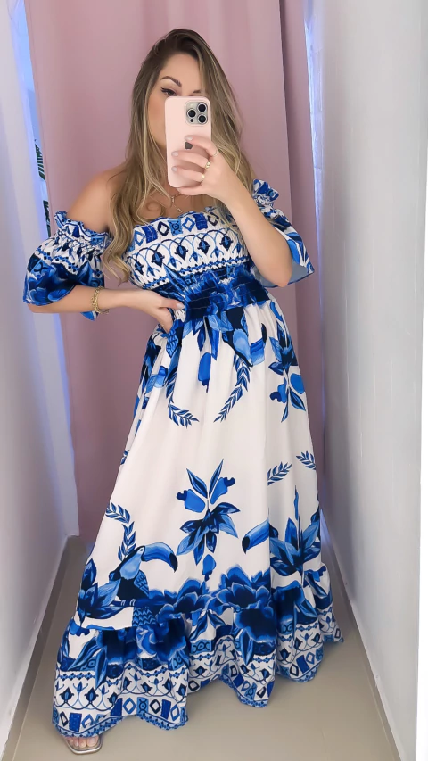 Esse longo maravilhoso tem toda a parte superior no lastex. Busto e braços.